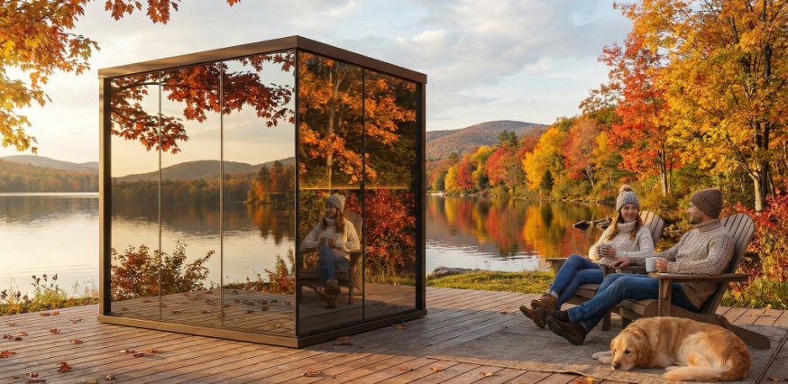 One of the most important innovations of the design sauna lies in the way it adapts to its surroundings. During the day, the mirrored surfaces reflect the landscape, allowing the panorama sauna experience to remain an organic part of the built environment. In the evening, the character of the space transforms: warm interior lighting and refined material choices create a protected, tranquil atmosphere. This innovative approach is not about visual impact, but about ensuring that the modern sauna house functions in a balanced and sustainable way over the long term.